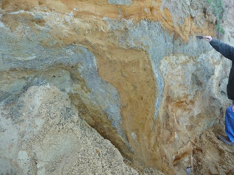 The master interpreter at work. Dr Emrys Phillips of the British Geological Survey, who has mapped and interpreted the cliff section from Weybourne to Runton, is explaining at the 2010 Geologists Association field meeting to West Runton how glacial ice was coming from the west and thrusting and deformed pre-existing drift and while also creating syngenetic sand basins that accumulated in the developing synclines. At this point, below the sand basin under the beach car park we are debating whether a sedimentary structure (below) is a fossil ice-wedge cast or a water-escape structure (he convinced us it was the latter).